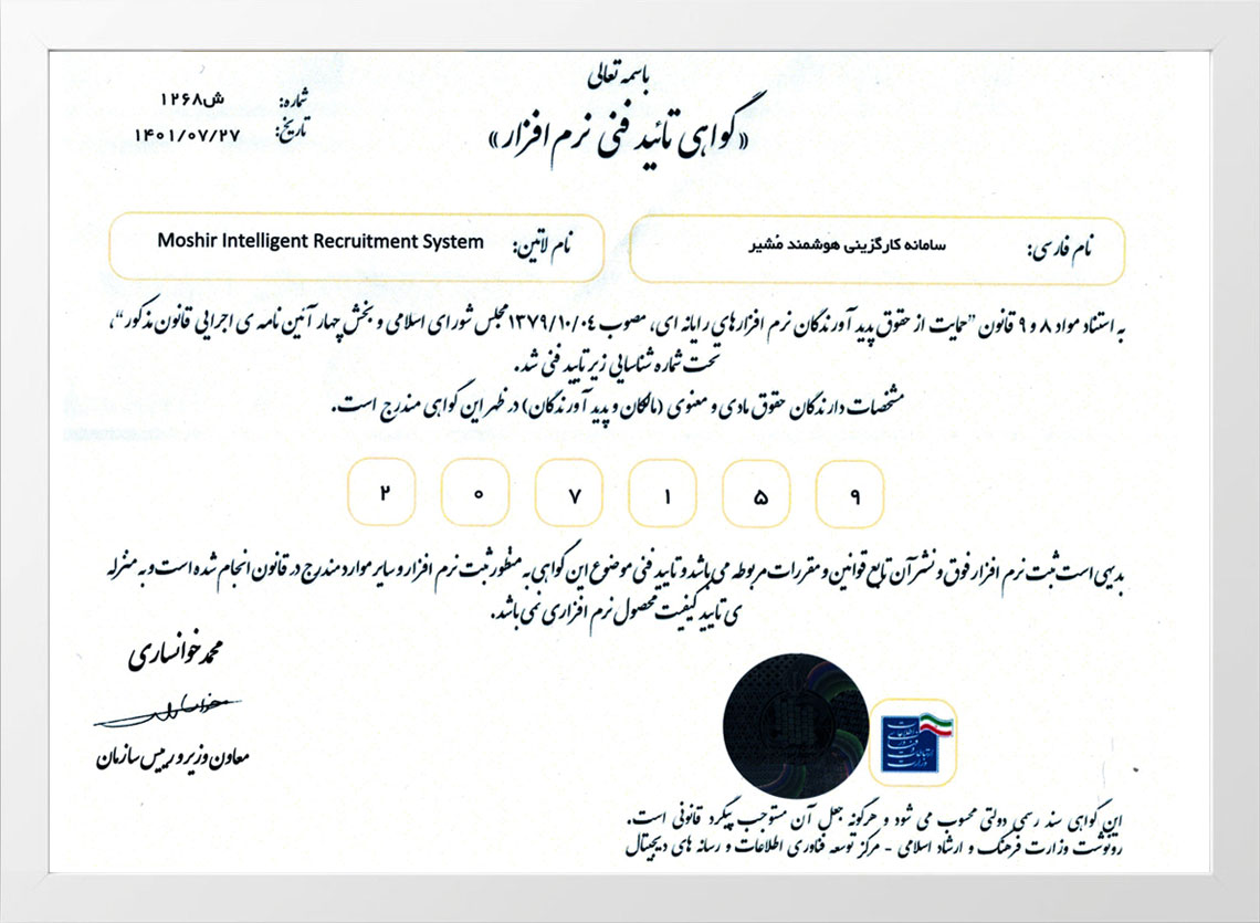 اولین سرویس هوشمند کارگزینی در ایران متعلق به شرکت دانش بنیان امید آیندگان توسعه پارس همراه با مجرب ترین تیم حقوقی روابط کار و سابقه ای بالغ بر 19سال ، تمامی موارد قانونی و استخدامی شما را تنظیم و ساماندهی نموده و به عنوان یک دستیار دقیق و هوشمند کنار شماست.